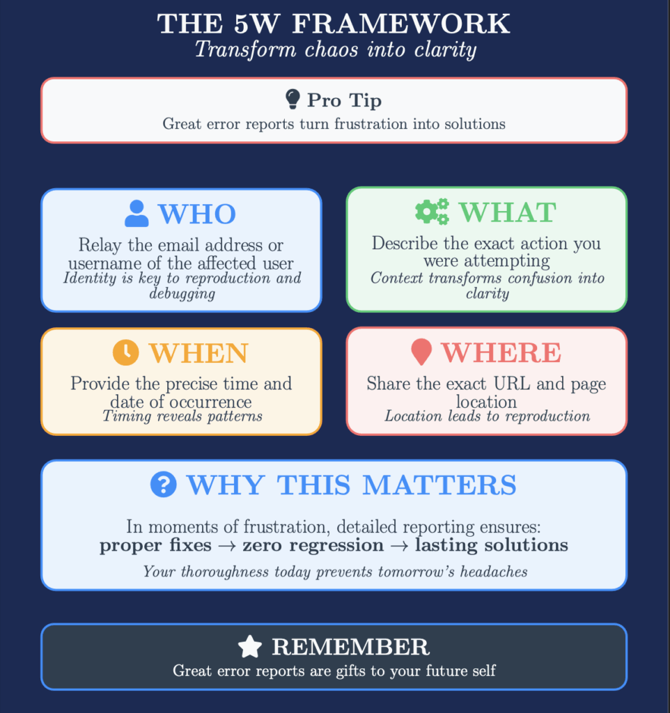 After too many of these dead ends, I started noticing a pattern. The best bug reports all answered the same set of questions. It reminded me of journalism’s who, what, when, where, why. That’s where the “5W Framework” came from—not as some polished methodology, just a shorthand for what makes a bug report actually useful.